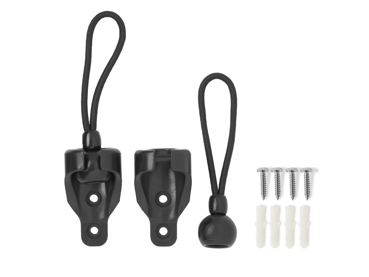 Set of (2) replacement bottom rail plugs with bungee holes (25 mm × 30 mm) in black for Coolaroo Outdoor Roller Shades without valances, compatible with shades produced after February 2025.