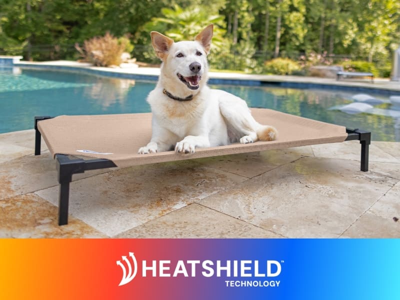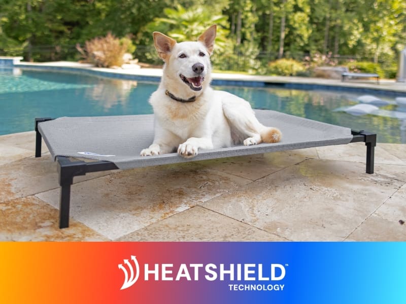 Featuring everything experts love about our Pro Elevated Dog bed (low-profile, use anywhere) plus our HeatShield™ fabric that feels up to 15°F cooler to the touch, for more comfortable pups and paws. Highlights: